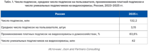 На конец 2025 года в среднем России было оформлено 3,15 подписки на одного пользователя видеосервисов. По сравнению с предыдущим годом этот показатель резко вырос за счет опережающего увеличения числа подписок и замедления роста проникновения.